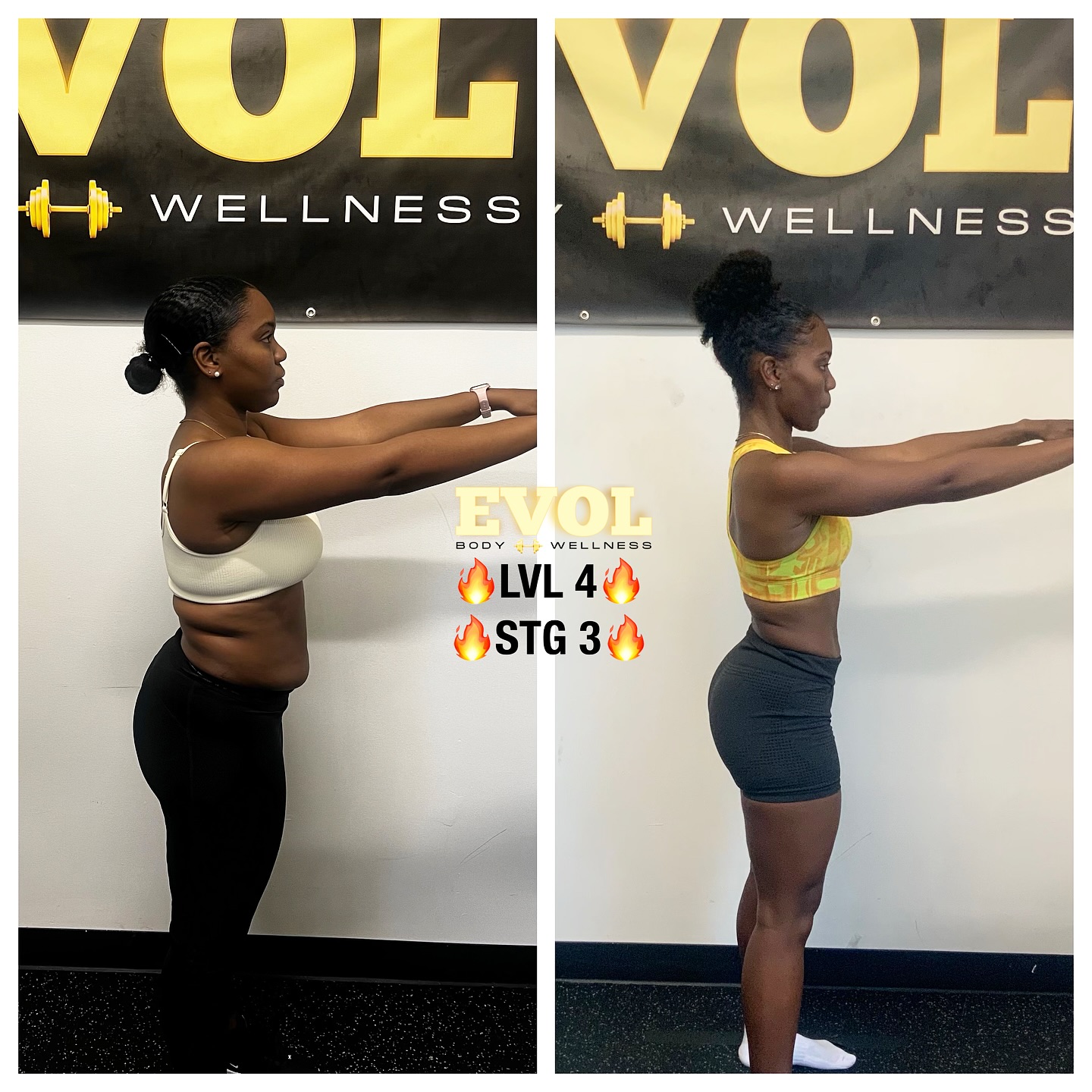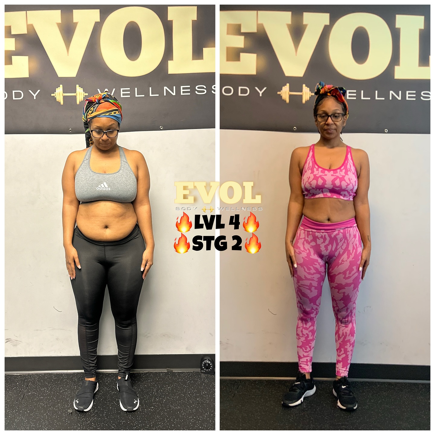 "These are the results of consistency in the Body Confidence Rebuild program by Coach Marie. From her first day to now - phenomenal work! Made the decision to do it for herself! Down 43 pounds, -8 inches from the waist line."